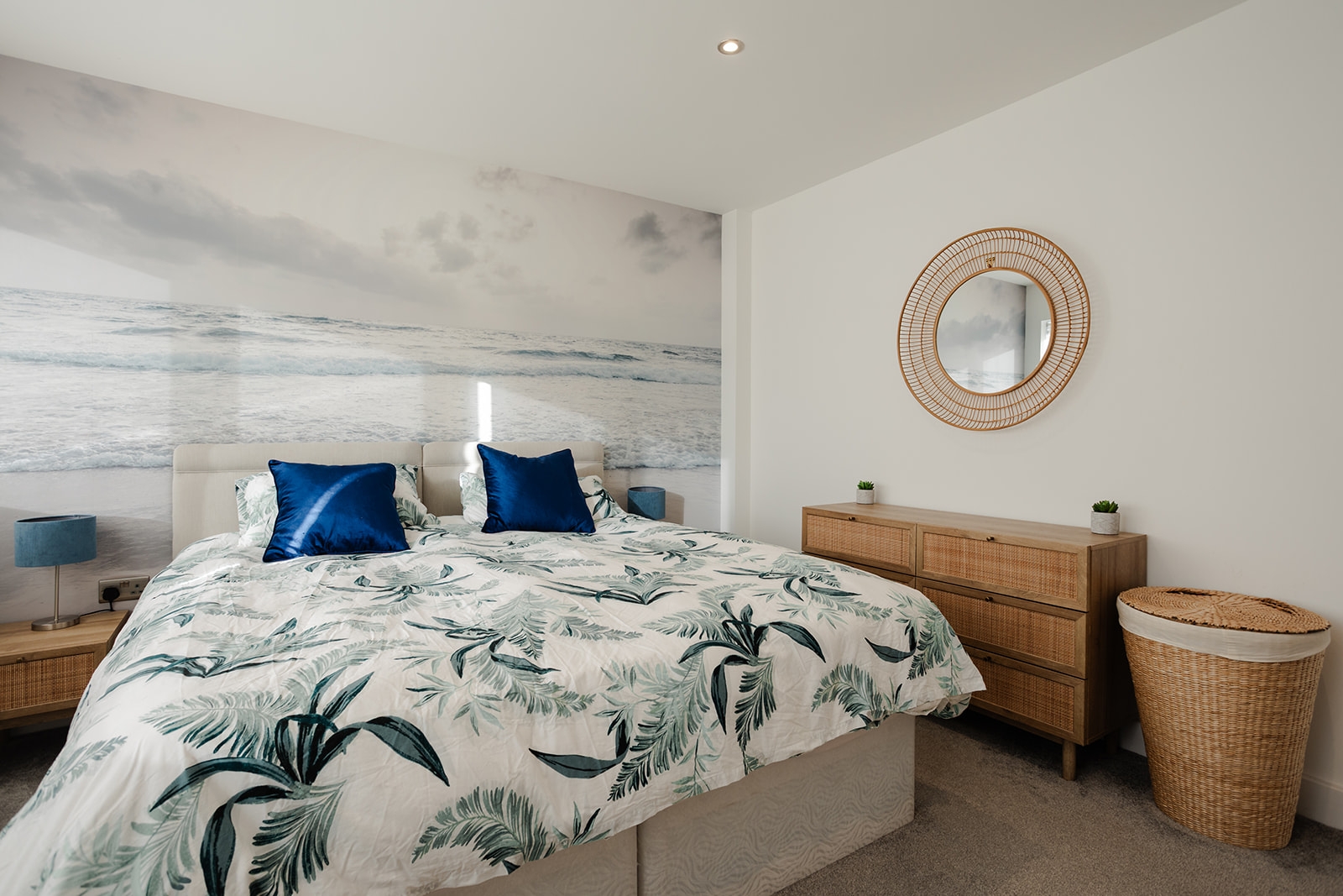 The first floor is home to the final bedroom, a spacious king-size retreat with a full-width balcony accessed via bi-fold doors that connect seamlessly to the living area. From here, guests can enjoy stunning sea views, providing a serene backdrop to wake up to each morning. This bedroom also features its own en-suite shower room, creating a peaceful and private haven.