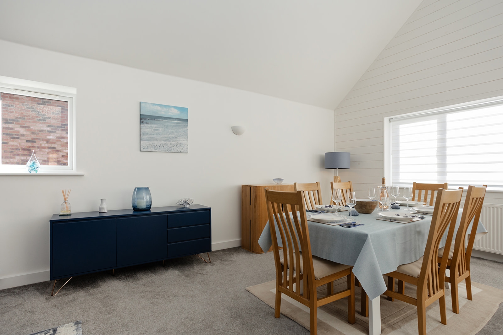 The open-plan living area is thoughtfully designed in a reverse-level layout to maximise the sea glimpses. The bright and inviting sitting area is perfect for relaxing, complete with a Smart TV for cosy movie nights. You can step out through a second set of bi-fold doors onto the furnished balcony, an ideal spot to enjoy a morning coffee or unwind in the evening air while taking in the coastal views.